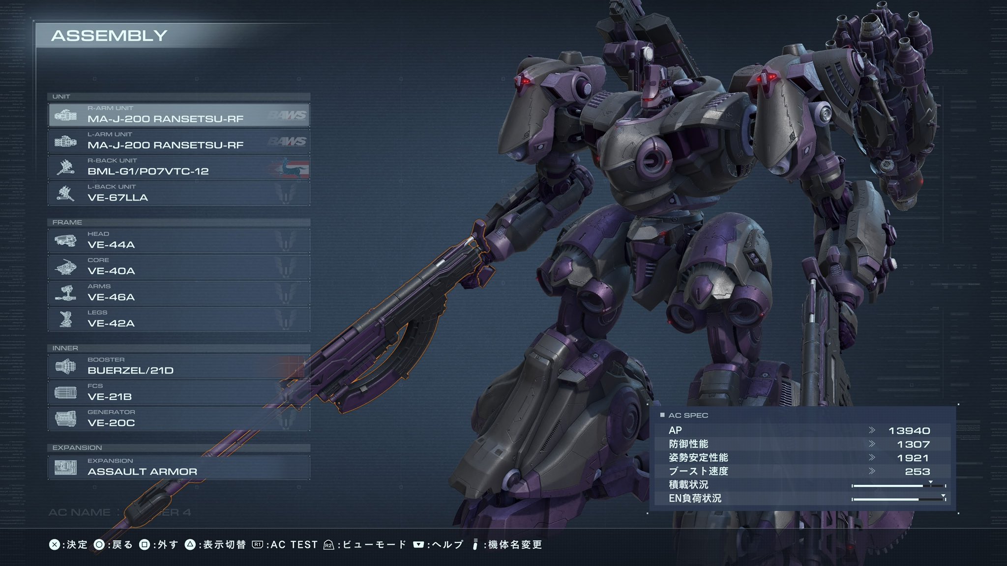 AC6。少し前のTLに、オープンフェイスのフレームにランセツと垂直12連ミサイルとハンガーでレザラン持たせたようなアセンが流れてきて、面白そうだから使ってみたかったけど細かいところ確認せず流してしまったので、記憶を頼りに組んでみた。